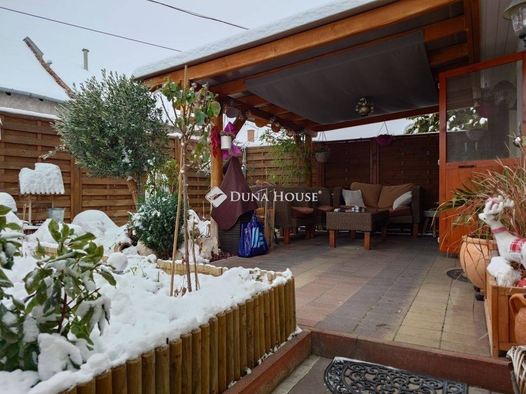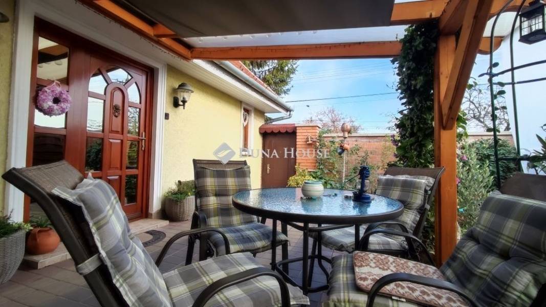 A házhoz tartozó kert kb. 40 m2, szépen parkosított, egy része térkővel burkolt. Ideális helyszín grillezéshez, összejövetelekhez.