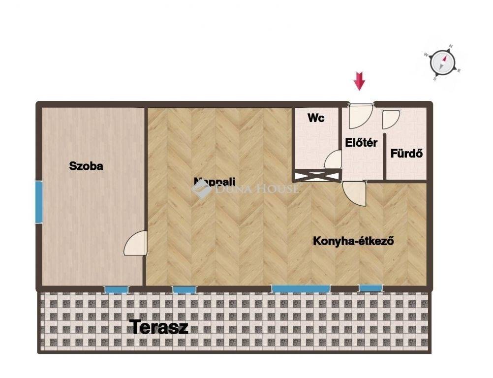 Az elrendezés praktikus és jól élhető: nappali + 1 hálószoba, fürdőszoba és külön WC.