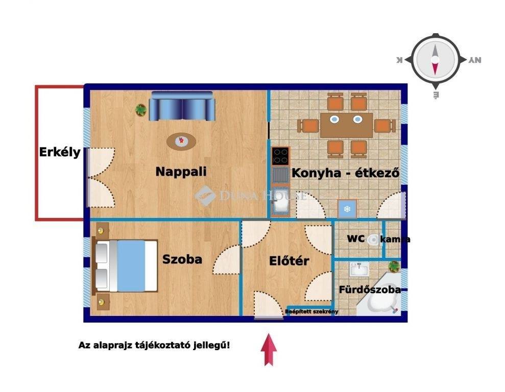 - Elosztás: egy szoba, erkélyes nappali, konyha-étkező, kamra, fürdőszoba, WC és előtér praktikus és kényelmes kialakítás.