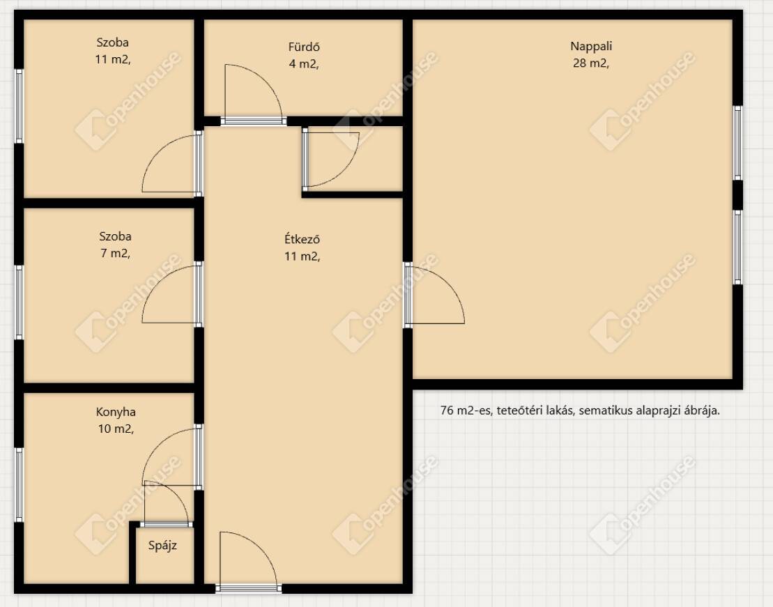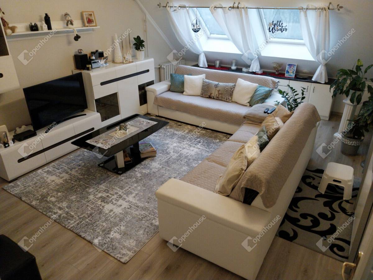 A lakás alapterülete 58 m2, a konyhában, a nappaliban és a két szobában a 180 cm alatti területeket is beleszámítva összesen 76 m2 a ténylegesen használható tér.