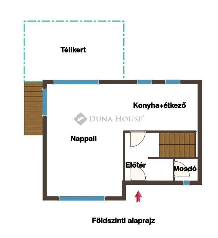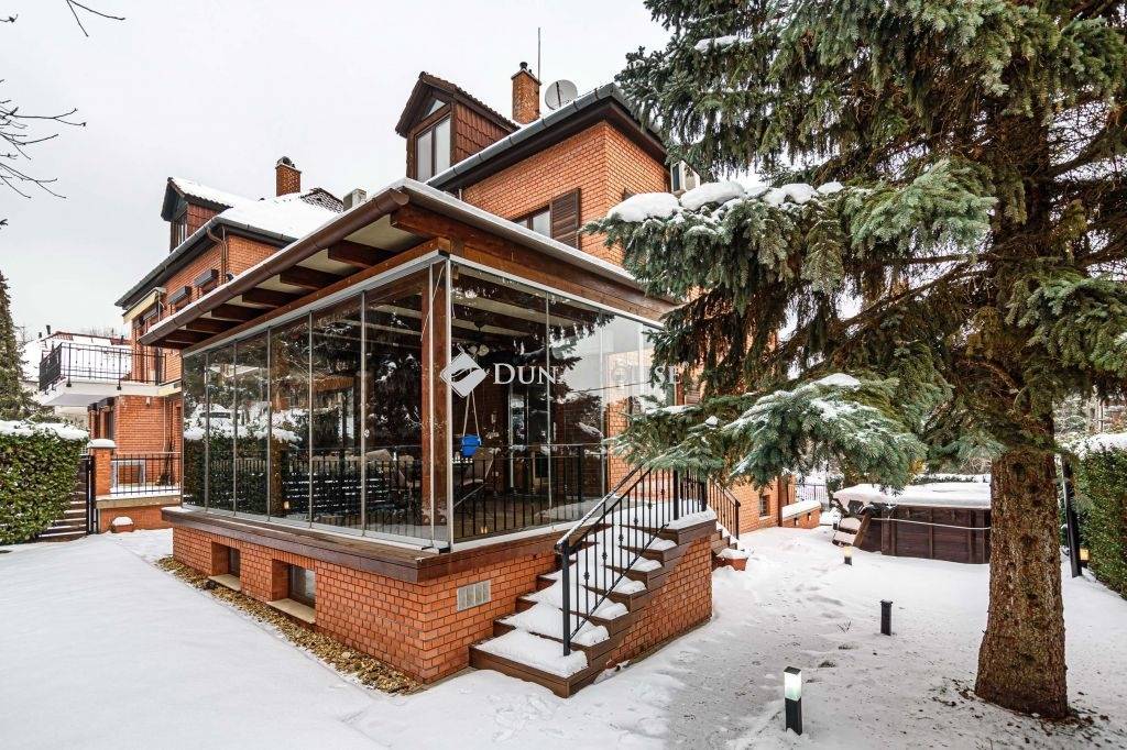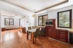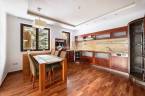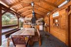 A konyha teljeskörűen gépesített, hatszemélyes étkezővel felszerelt. A nappaliból közvetlen kijárat nyílik a 31 m2-es fedett, fűthető, tolható üvegajtókkal felszerelt teraszra, mely télen nyáron jól használható.