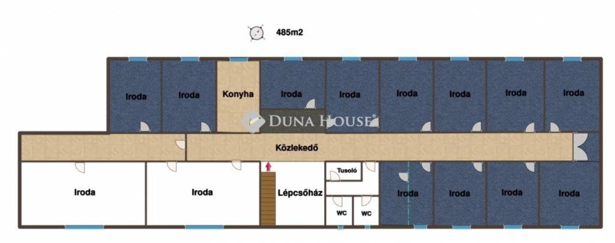 Korszerű, téglaépítésű ingatlan, 485 m² alapterület, 14 különálló irodahelyiség,teakonyha, tusoló és mellékhelyiségek.