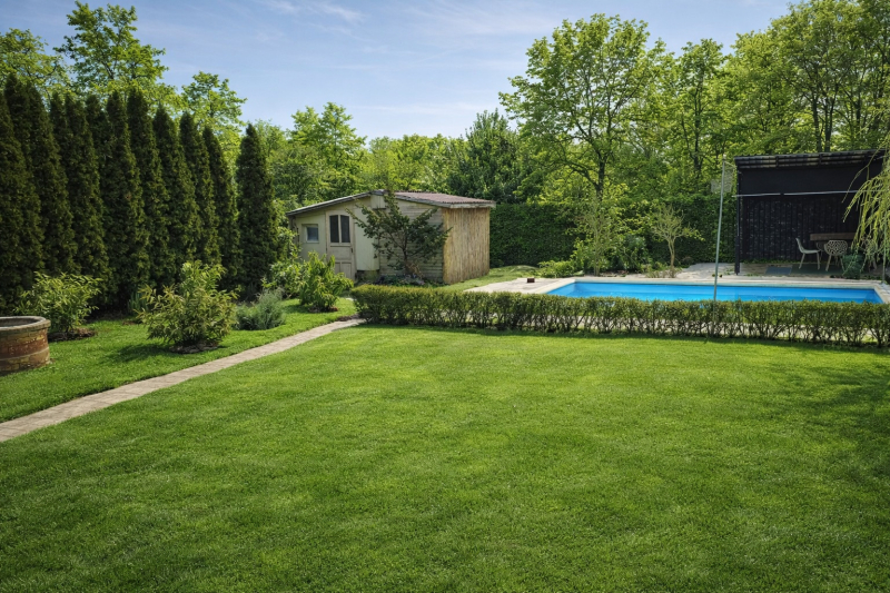 A körben napozott udvar valódi oázis: igényesen parkosított kert, medence, kültéri tároló és garázs teszi teljessé ezt a prémium otthont.