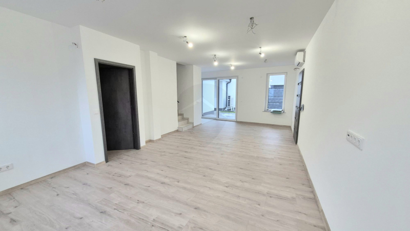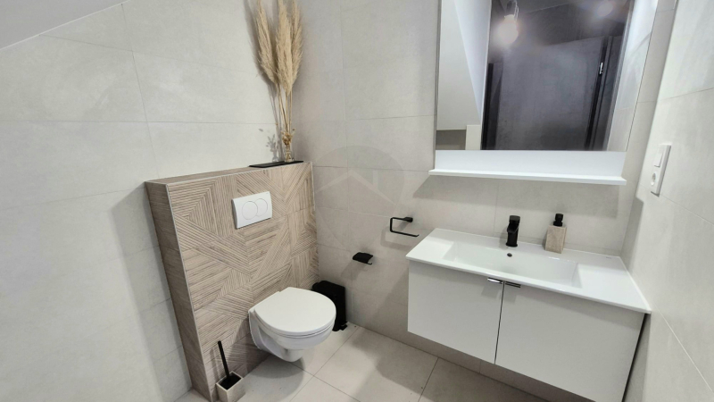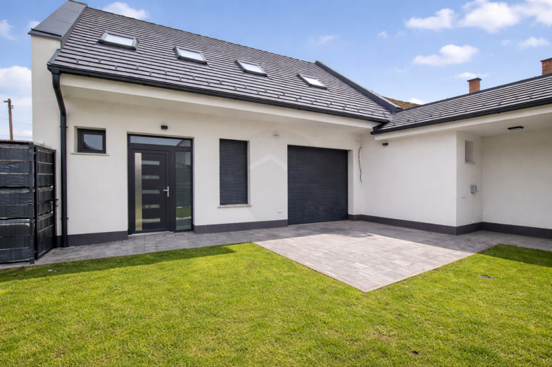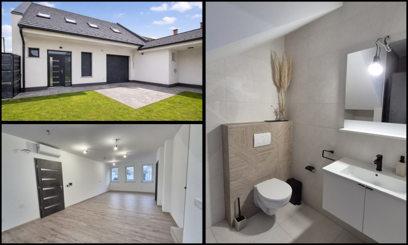 A földszinten a tágas, egybenyitott konyha–nappali–étkező a családi élet központja, amelyhez egy külön szoba, kamra és fürdőszoba kapcsolódik, valamint közvetlen átjárás nyílik a garázsból a lakótérbe. Az emeleten három hálószoba, gardrób, tároló és egy további fürdőszoba kapott helyet, így a ház ideális nagyobb család számára is. A szobák laminált burkolatot kaptak, a komfortérzetet hőszivattyús fűtés, klímák és kedvező H tarifa biztosítjanyilászárok 3 rétegűek.