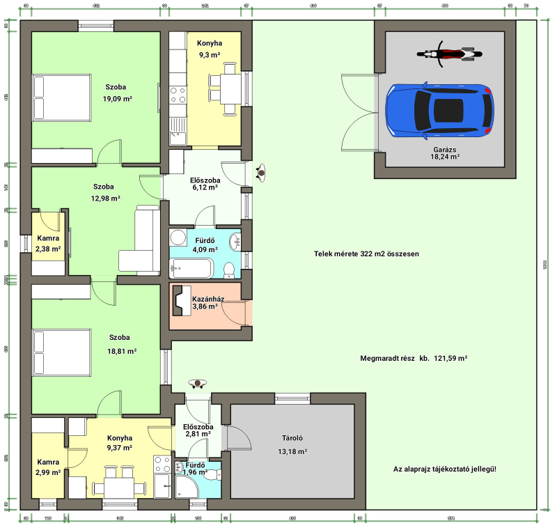 Egy téglából épült GARÁZS található az utcafronton, viszont jelenleg a kapu elhelyezkedése és a mérete miatt csak egy kisebb autó fér el, de könnyen átalakítható.