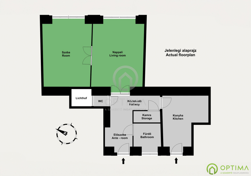 • A konyhai oldalon található második bejárat jelenleg ajtóként funkcionál, és a felújítás során a vevő döntheti el, hogy ezt a külön bejáratot megtartja, vagy a koncepcióhoz igazodva inkább ablakos megoldásra alakítja