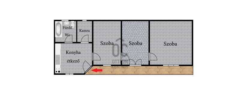 Az utcáról az udvaron át megközelíthető házba, a kis fedett teraszról léphetünk, a konyha-étkezőbe, melyből a mosdó, a spejz, és egymást követően a szobák érhetők el.