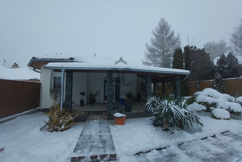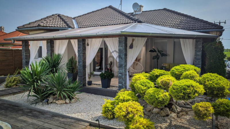 A kiváló állapotú lakóépület különleges, barátságos megjelenését a sokszögű kialakítás, az óriási fedett terasz és a nagyméretű nyílászárók teszik.