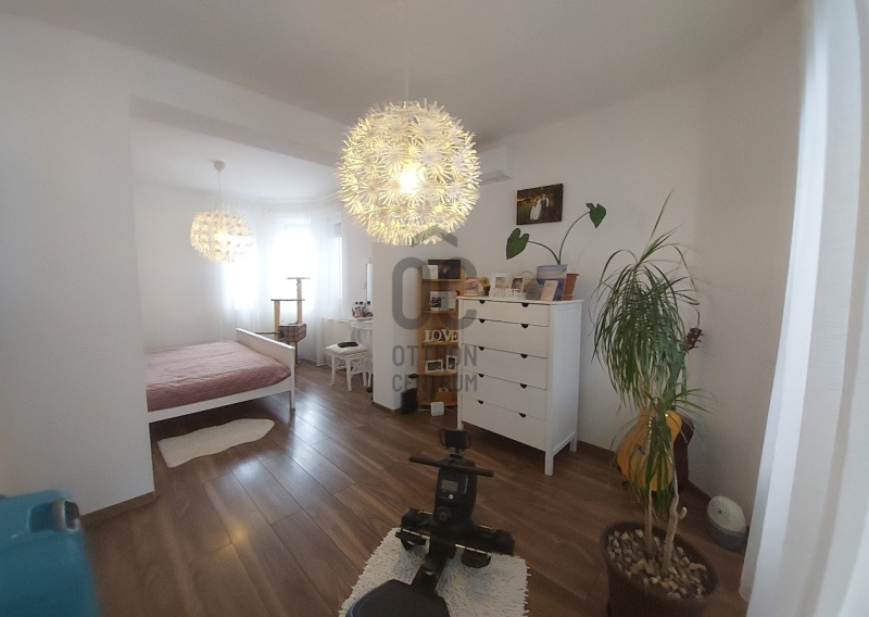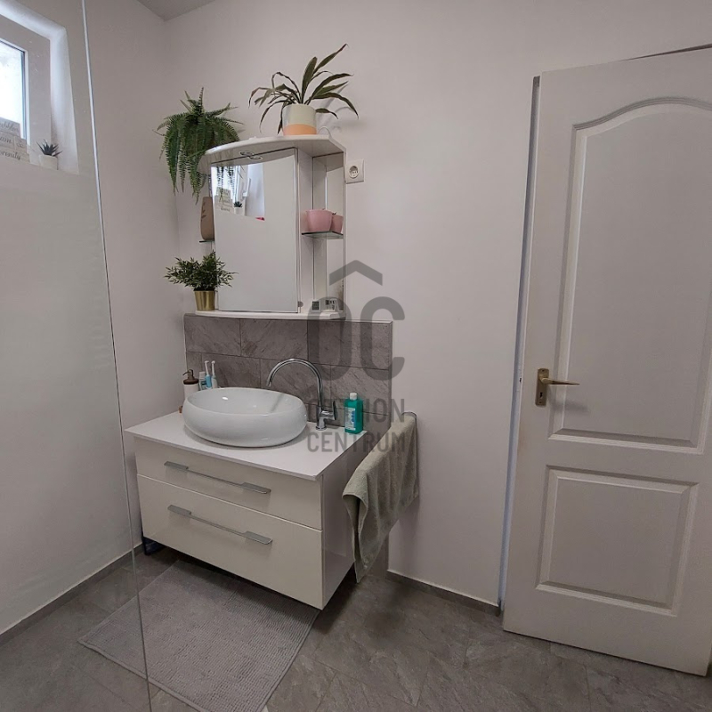 Előtér, háztartási helyiség, tágas, világos amerikai konyhás nappali, egy nagyobb szoba, ami 2 kis szobává alakítható, hálószoba gardróbbal, külön wc, és egy szép, felújított fürdőszoba-wc. A teraszra a nappaliból, és egy szobából is kiléphetünk. A nagy fedett terasz kiváló életteret biztosít a család, és vendégeik számára.