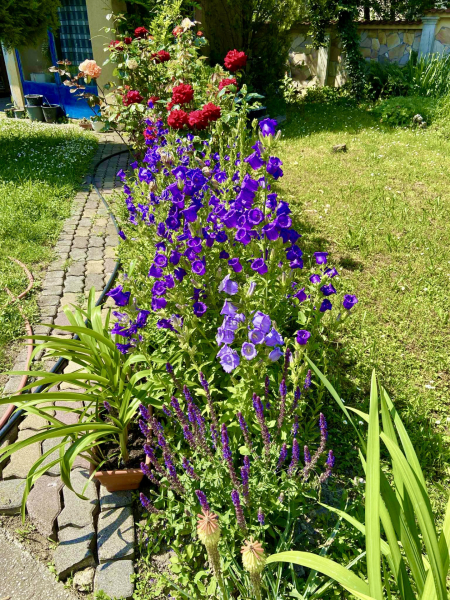 A kert rendezett,szépen virágosított, karbantartott.