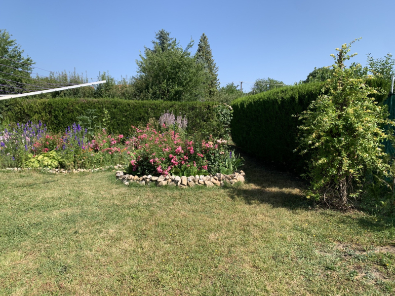 A kert ideális méretű, körül határolt, rendezett, szépen parkosított.