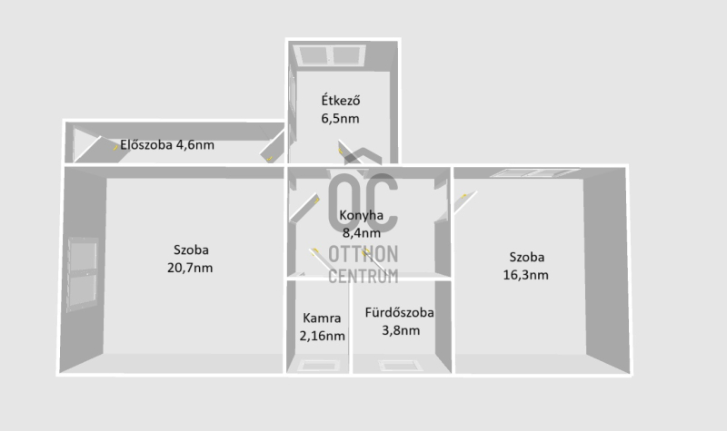 A házba érve egy előszobába érkezünk, majd egy tágas étkezőbe, ezután találjuk a konyhát, 2 nagy szobát, fürdőszobát és egy kamrát is.
