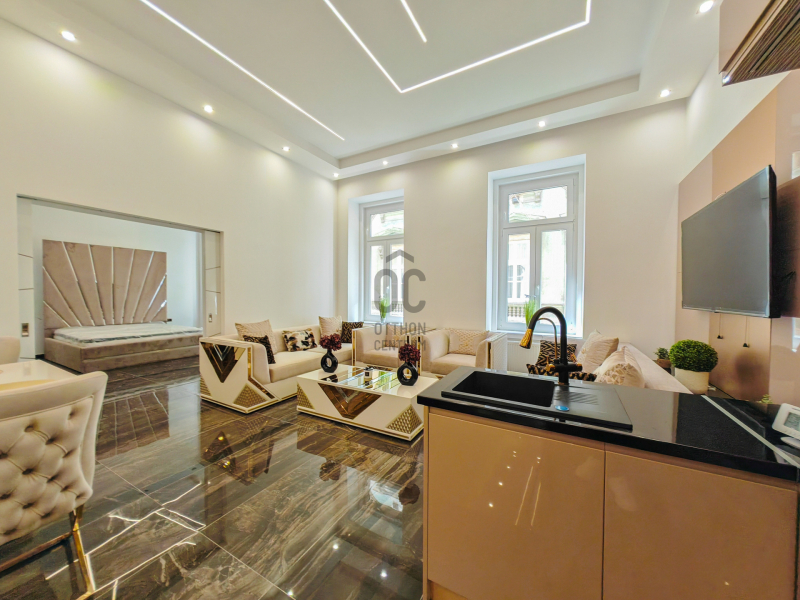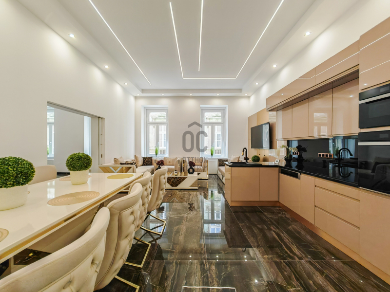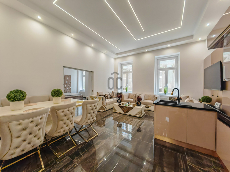 Eladó Budapest pezsgő belvárosában, a VII. kerület egyik legkedveltebb részén a Gozsdunál, egy minden részletében újjávarázsolt, 98 m²-es luxuslakás.
