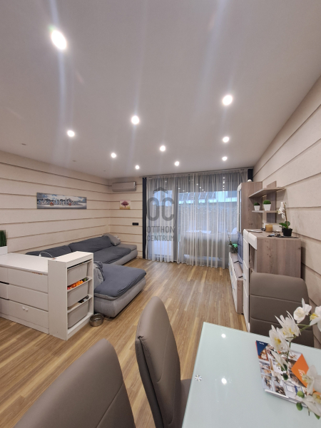 A lakás elrendezése ideális, a központi helyiség a tágas nappali, amelyből közvetlenül elérhető az amerikai konyha, amely a családi együttlétek és baráti összejövetelek valódi középpontjául szolgálhat.