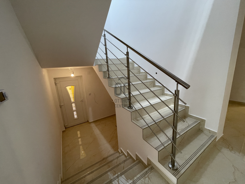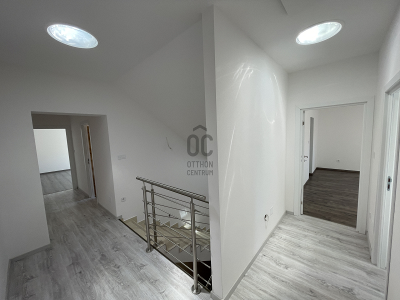 Emelet helyiségei: 2 hálószoba+ 1 gardrób, sarokkádas fürdőszoba WC- vel, gépészetnek kialakított helyiség mosókonyhával.