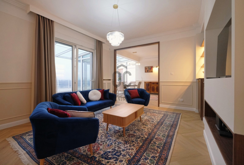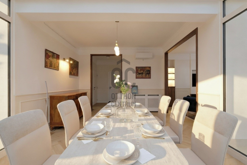 A 110 m²-es, belsőépítész által megálmodott otthon a kifinomult dizájn és a mindennapi kényelem kiegyensúlyozott elegyét kínálja. A lakás szíve az üvegfalú télikert-étkező, ahol télen-nyáron természetes fényben élvezheti a Dunára és a budai hegyekre nyíló kilátást.