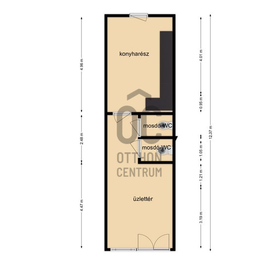Tulajdoni lapon is üzlethelyiségként nyilvántarott helyiség, rendelkezik 2 db WC-mosdó helyiséggel, ipari árammal,