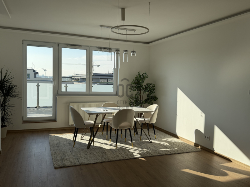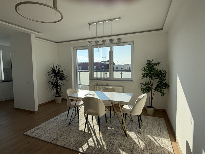 Fedezze fel Budapest 13. kerületének egyik legvonzóbb ingatlanját, amely tökéletes választás fiatal felnőttek számára, akik modern és kényelmes otthont keresnek. Ez a kiváló állapotú, 94.39 nm alapterületű lakás Angyalföld szívében található, egy felkapott lakóparkban, ahol a csendes környezet és a kiváló ellátottság egyaránt garantált. Az ingatlan négy tágas szobával rendelkezik, melyek közül a nappali különösen világos és barátságos, ideális helyszín a baráti összejövetelekhez vagy a családi programokhoz. Az amerikai konyhás elrendezés lehetővé teszi a közös főzést és étkezést, miközben a terasz mérete, amely 36.2 nm, tökéletes a nyári esték eltöltésére a szabadban. Az ingatlanhoz tartozik egy 8.16 nm-es erkély is, ahol élvezheti a friss levegőt és a gyönyörű kilátást. A lakás akadálymentesített, így mindenki számára könnyen megközelíthető, és kisállattal is költözhető. A biztonsági ajtó és a házközponti fűtés egyedi méréssel garantálja a lakás biztonságát és kényelmét. A klíma pedig a nyári hónapokban biztosítja a hűvös levegőt. A környék ellátottsága kiváló, hiszen a közlekedési csomópont közelében helyezkedik el, így a város bármely pontjára könnyen eljuthat. A tömegközlekedés szempontjából ideális, hiszen a busz- és villamosmegállók mindössze pár perc sétára találhatók. A csendes utcák és a rendezett kert a lakópark körül pedig egy kellemes, kertvárosi hangulatot árasztanak, ahol a mindennapi élet nyugalma garantált. Ez a penthouse stílusú lakás nem csupán otthon, hanem egy életstílus is, amely a modern városi élet minden előnyét kínálja. Az ingatlan központi elhelyezkedése lehetővé teszi, hogy közel maradjon a város pezsgéséhez, miközben a lakás falain belül a nyugalom és a kényelem várja. Amennyiben felkeltette érdeklődését ez a különleges ingatlan, ne habozzon felvenni velünk a kapcsolatot. Bizalommal kereshet minket bármilyen kérdéssel vagy további információval kapcsolatban, hiszen célunk, hogy segíthessünk Önnek megtalálni álmai otthonát vagy befektetési lehetőségét.