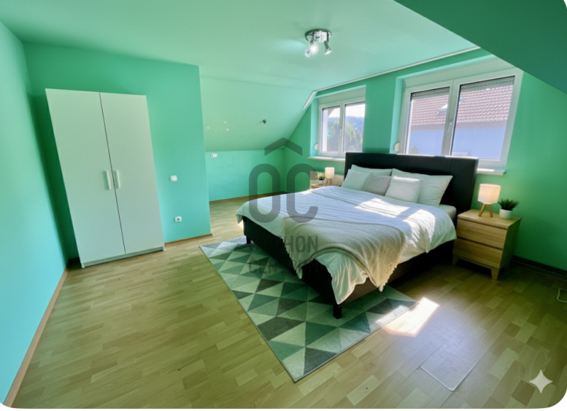 A ház két perc sétára van az erdőtől, itt mindenki megtalálja a természet pihentető levegőjét. Több fűtési rendszer is kínál alternatívát.