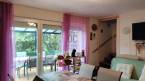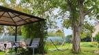 A 720 m²-es, gondozott kertben dús pázsit, virágzó rózsabokrok, néhány szőlőtőke, sudár örökzöldek árnyékot adva a teraszon pihenőknek.