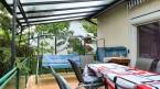 A kertben további praktikus elem egy elhúzható tetejű mobil gépkocsibeálló.