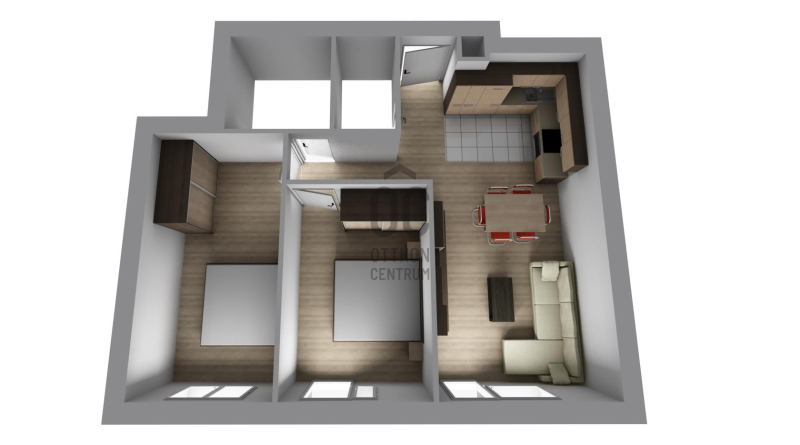 •nappali + 2 külön nyíló, ablakos hálószoba