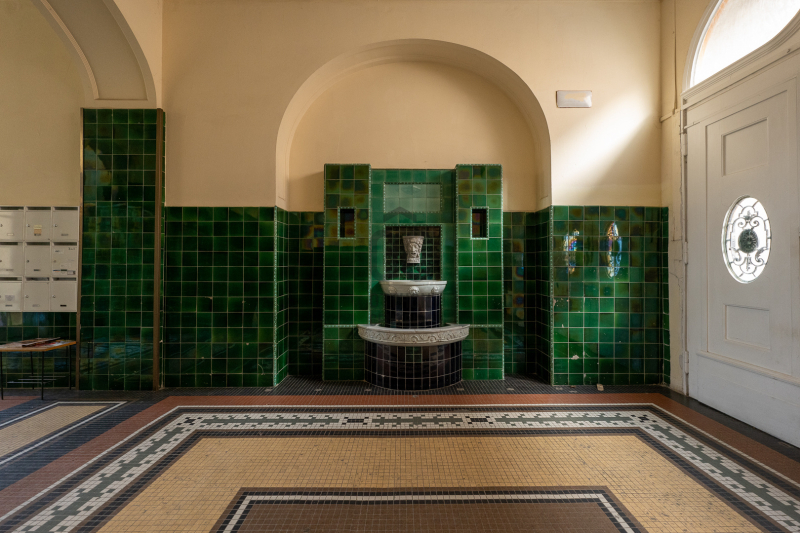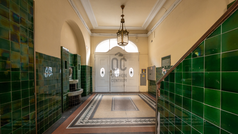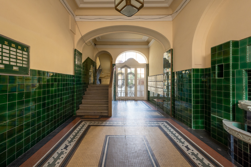 A lakás egy 1910 körül épült, tervező: Porgesz József, historizáló/koraeklektikus stílusú társas ház első emeletén helyezkedik el, hangulatos belső kertre néző ablakokkal. Az épület Budapest fővárosi helyi védettségű építészeti örökség, homlokzata kiváló állapotú, a díszes, művészien megmunkált kapubejárat pedig a századforduló eleganciáját idézi. A védettségnek köszönhetően a kapualj és a lépcsőház is gondosan karbantartott, rendezett állapotú.