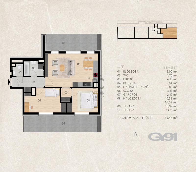 Kiemelt figyelmet érdemel a lakóépület legfelső, negyedik emelete, ahol az utcai és udvari homlokzati falak visszahúzása miatt: