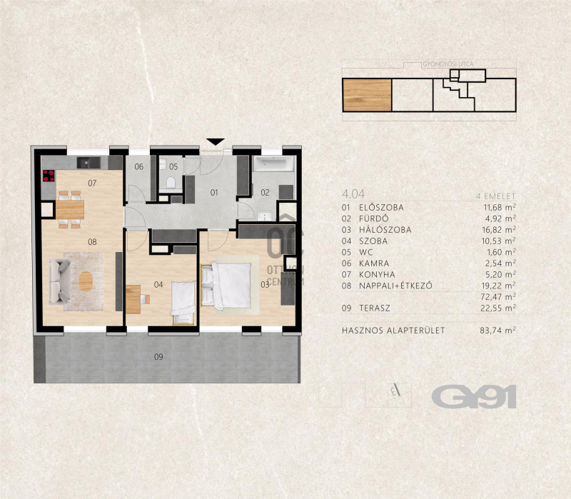 Kiemelt figyelmet érdemel a lakóépület legfelső, negyedik emelete, ahol az utcai és udvari homlokzati falak visszahúzása miatt:
