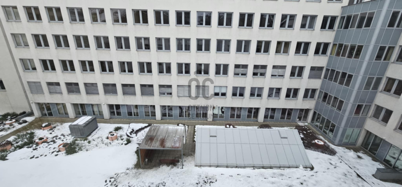 Az ablakok egy csendes irodaépület belső udvarára néznek.
