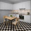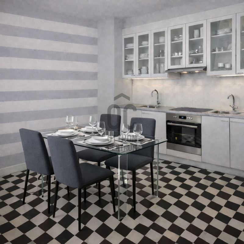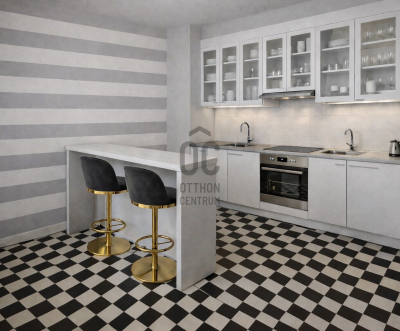 A méretes konyha-étkező is ablakos, az átalakítás során adja magát, hogy funkcióváltással szobát alkossanak belőle, mert a konyhát a lakás több egyéb pontján is el lehet(ne) helyezni.