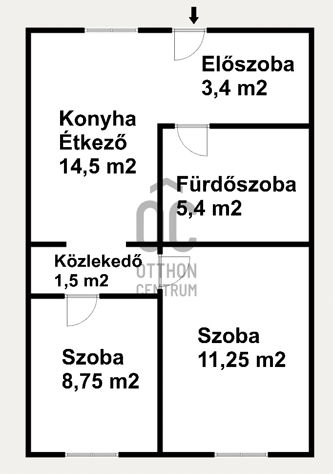 részei: konyha-étkező, 2 hálószoba, fürdőszoba, közlekedő, előszoba.