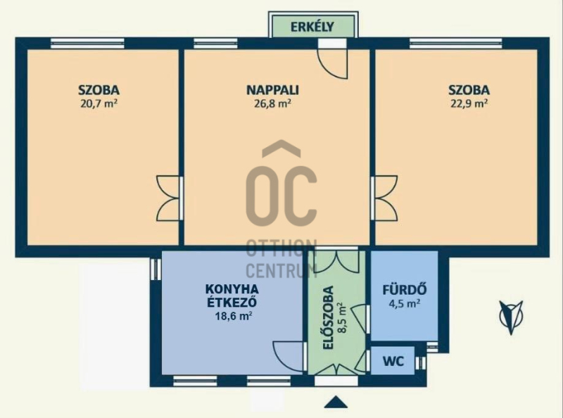 nappali + 2 hálószoba + konyha/étkező + fürdő + külön WC + erkély