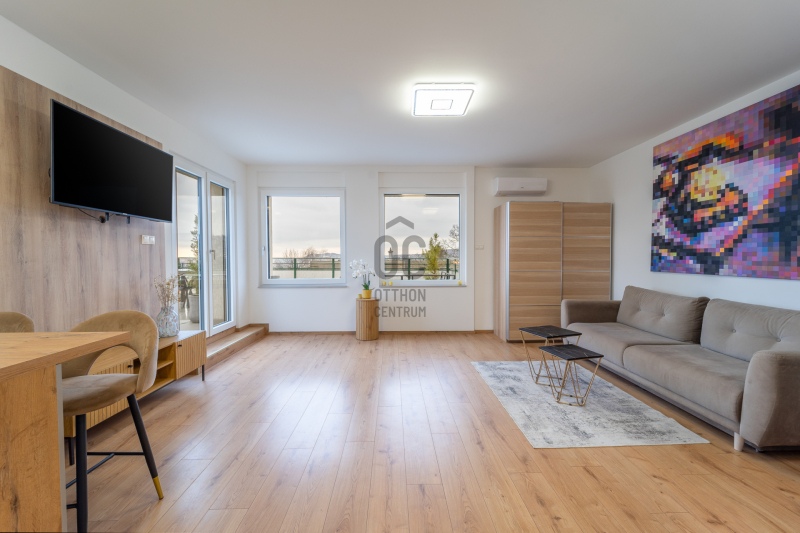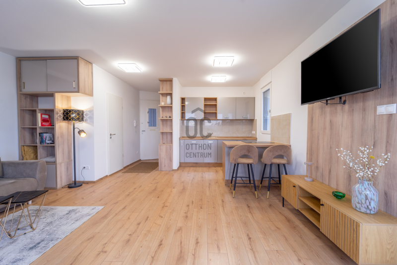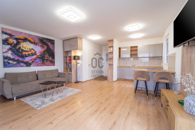 A lakás fűtése korszerű elektromos padlófűtéssel megoldott, amely tovább erősíti a letisztult, komfortos életteret. A konyha magasfényű, osztrák gyártású bútorzattal készült, beépített AEG és Bosch gépekkel; a konyhasziget a mindennapok természetes középpontja, ahol a design és a funkcionalitás magától értetődően találkozik.