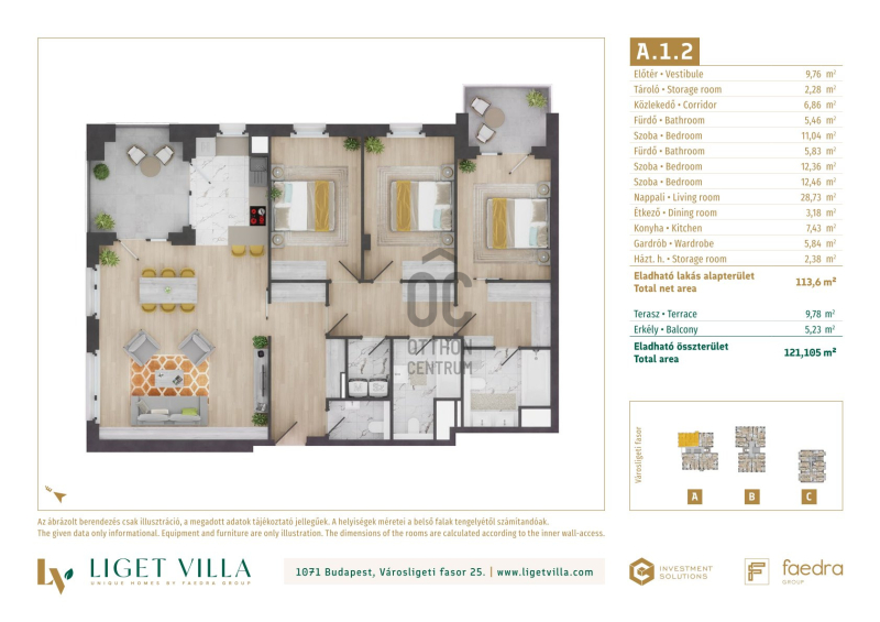 A pesti diplomatanegyed legszebb utcájában épül, a megjelenésében, műszaki tartalmában és a lakáskínálata tekintetében egyaránt unikális, Liget Villa Lakópark. Az épületbe érve, egy elegáns lobby és recepcióra érkezünk majd. Innen a három épületet egy kerti úton, passzázs köti majd össze. A tervezés során nagy hangsúlyt kapott a családi igényekre tervezett lakás minőségi használhatósága. Ablakos konyhák, master bedroom-ok, dupla fürdőszobák, gardrób és háztartási helyiségek is helyet kapnak a lakásban. Kiemelten jól bútorzható, két irányba tájolt lakások kerülnek kialakításra. A földszinti lakásokhoz 50-100 m2-es privát kertek, míg a közös területeken tájépítész által tervezett reprezentatív kertet alakítunk ki. A lakásokban mennyezeti hűtés-fűtés biztosítja a téli-nyári kellemes komfortérzetet. A nyílászárók 3 rétegű üveggel, alu-fa kivitelben kerülnek beépítésre. A lakások ára tartalmazza alapárban az alu elektromos redőnyöket és okosotthon kiépítést is. Magas minőségű olasz és spanyol hidegburkolatválasztékban akár 60x60 cm-es lapok is válaszhatóak majd. A fa parketta és az átlag feletti minőség szaniterek, szintén alapárban válaszhatóak a lakásokba. Az épületek alatti mélygarázsban gépkocsibeállók és tárolók kerülnek kialakításra.