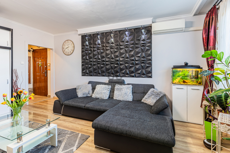 Az 53 m2-es, nappali + 2 hálószobás lakásban felújításra került az elektromos hálózat, 2 hűtő-fűtő klíma került beszerelésre. Kialakításra került egy nagy ablakos, mordern, gépesített konyha, kis étkezősarokkal. A fürdőszoba és a külön helyiségben lévő mellékhelyiség is átépítésen esett át. Mindenhol új, modern burkolatok, desing elemek kerültek beépítésre. A lakásban egy különálló, rendkívül praktikus háztartási helyiség is kialakításra került, ahol a mindetn elnyelő polcok mellett, a mosó- és szárítógép, valamint a hűtőszekrény is helyet kapott.