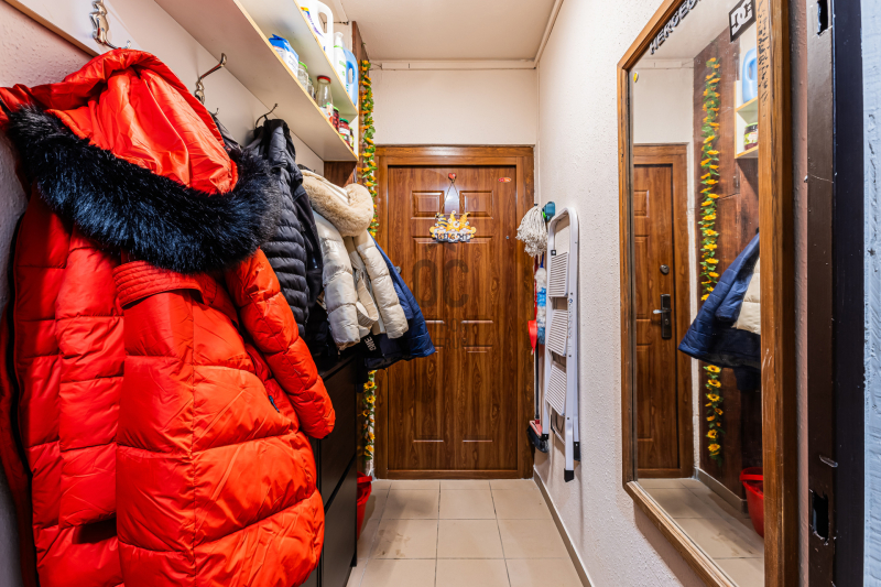 A lakás előtt leválasztára került egy folyosószakasz, amely praktikus előszobaként funkcionál.