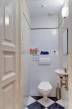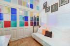 A lakás az első emeleten van, utcai nézetű nagy ablakai vannak, világos és barátságos.