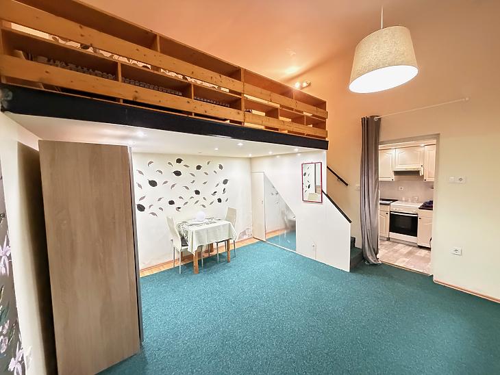 A földszinti ingatlan 1 szoba + konyhás kialakítású, galériával bővítve, amely kényelmes alvóteret biztosít, így a lakótér jól kihasználható. A galéria belmagassága 160 cm. A lakáshoz külön tároló is tartozik, ami tovább növeli a praktikumot.