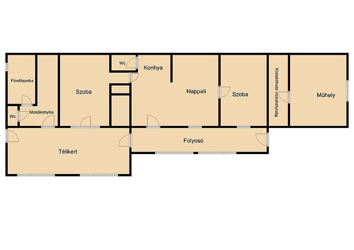 Az ingatlan jelenlegi elosztása 3 szobából, konyhából, egy fürdőszobából, egy mosókonyhából és egy télikertből épül fel.
