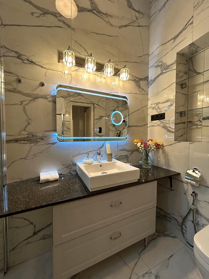 A fűtést padlófűtés és elektromos kandalló kombinációja biztosítja, a lakás modern okoselemekkel felszerelt és légkondicionált, gáz nincs bekötve.