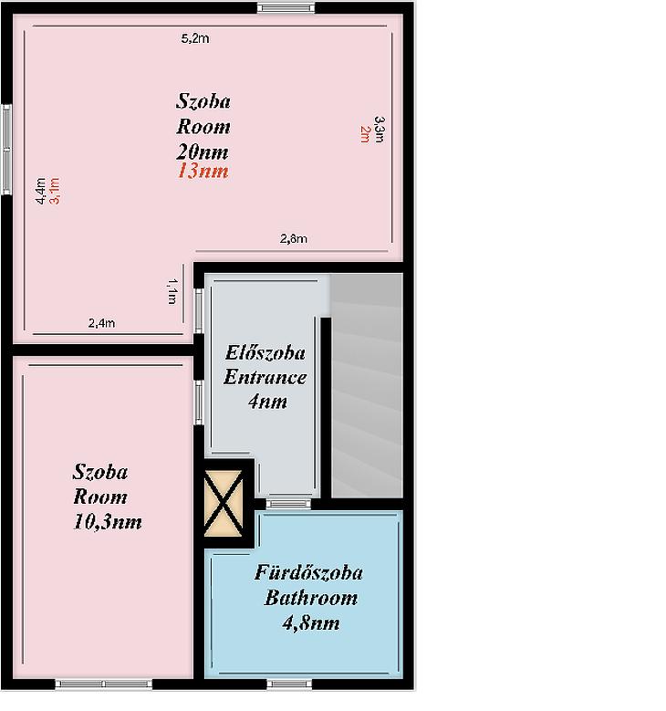 Az alsó szinten egy világos szoba, konyha, étkező, külön WC és tároló található, praktikus és jól élhető elrendezéssel. Az emeleti szinten két kényelmes hálószoba és egy fürdőszoba kapott helyet, biztosítva a privát életteret a család számára.