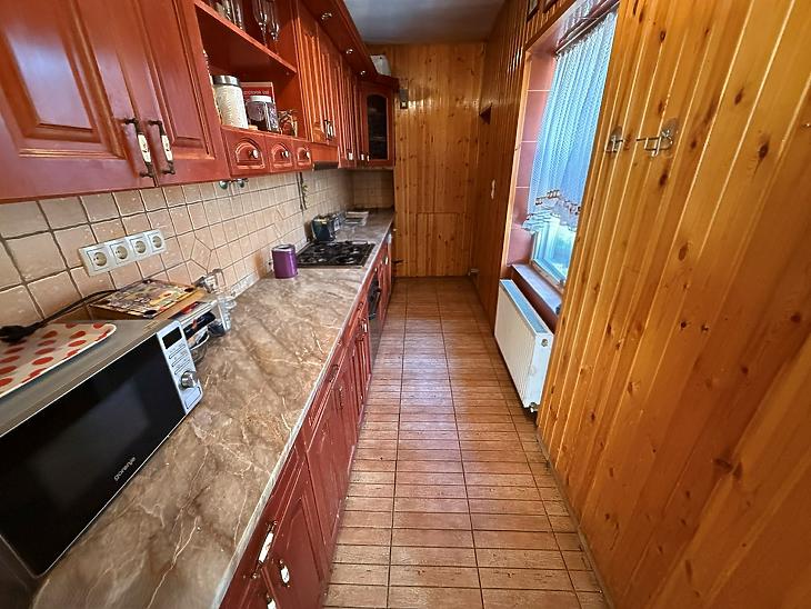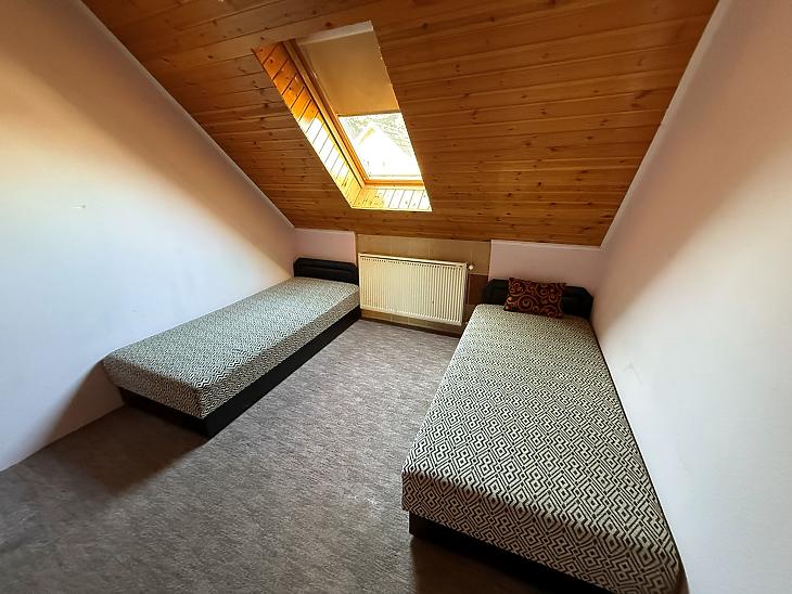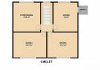Emelet: 3 szoba, zuhanyzós fürdőszoba + mellékhelyiség, közlekedő, erkély.