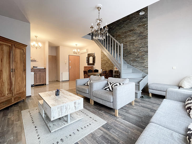 A 2014-ben megújult, parkosított Teleki László téren, egy 2000 után épült, liftes társasház negyedik emeletén (legfelső szintjén) eladó egy kétszintes, két fürdőszobás újszerű lakás.