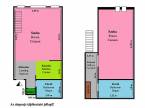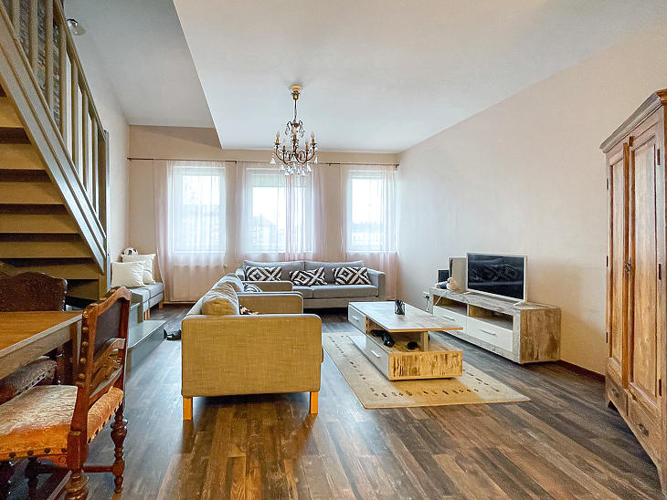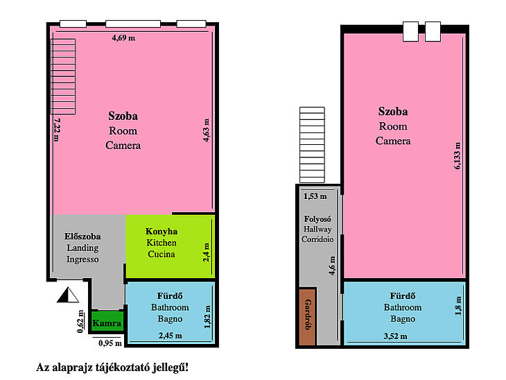 Az alsó szinten tágas, utcai nézetű, amerikai konyhás tágas nappali található délkeleti tájolással, valamint egy kamra és egy fürdőszoba. A felső szinten előtér, gardróbhelyiség, hálószoba és egy másik fürdőszoba kapott helyet.