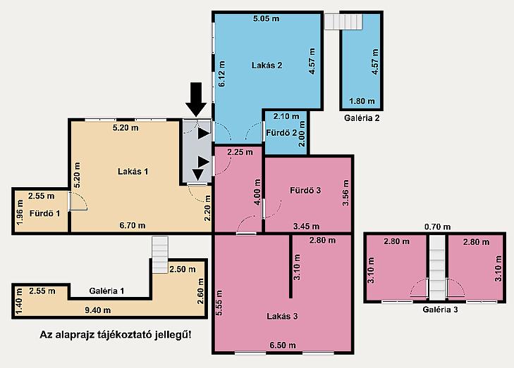 A 4,10 méteres belmagasság lehetővé tette, hogy mindhárom lakás állógalériával rendelkezzen, ami jelentősen növeli a hasznos alapterületet, és egyedi hangulatot kölcsönöz az ingatlannak. A lakások közös gázcirkó fűtéssel működnek. Az ingatlan utcára és udvarra néző ablakokkal is rendelkezik, így világos és jól átszellőztethető.