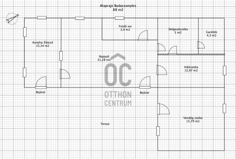 Az 88 m2-es tégla falazatú földszintes házban, egy tágas nappali, fürdő-wc, konyha-étkező, hálószoba, dolgozószoba és gardrób került kialakításra.