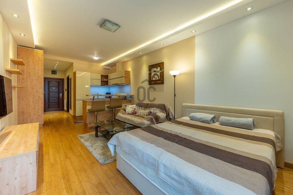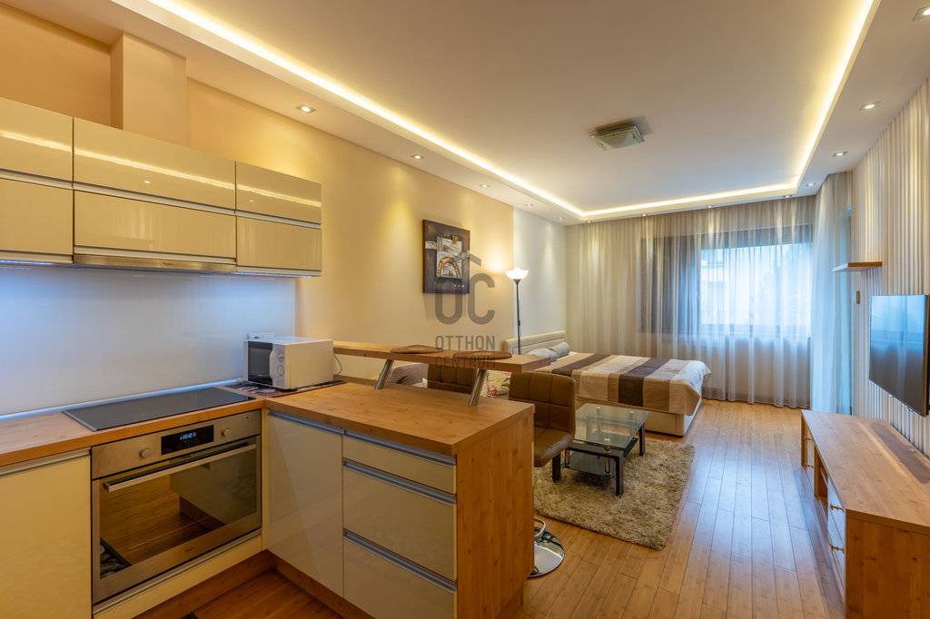 A lakás egyszobás, egylégterű kialakítású, amerikai konyhás nappalival, amely praktikus és jól kihasználható életteret kínál.