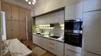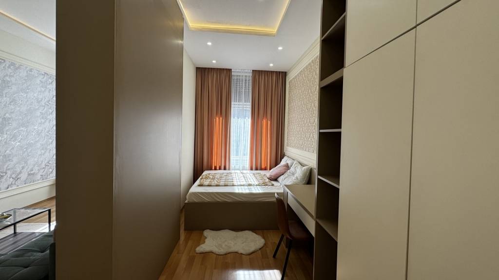 The apartment is characterized by elegant interiors, new, high-quality flooring, and uniquely designed wall surfaces. It comes with a modern, equipped kitchen and two bathrooms with quality tiles and fixtures, each featuring a shower.