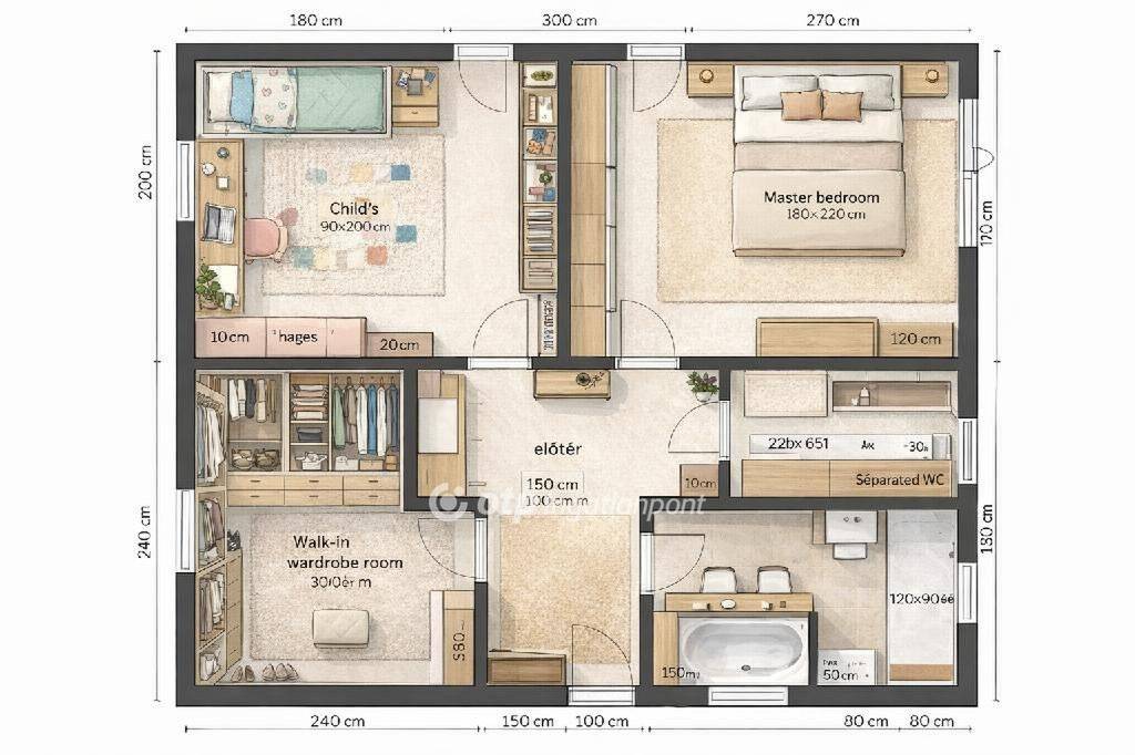 közlekedő, 2 hálószoba, gardrób, fürdőszoba káddal, wc